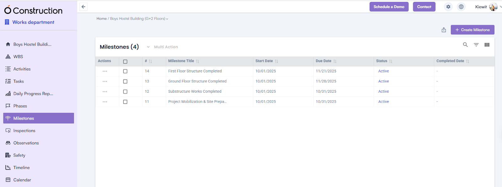 - Milestone Inspection: Monitor and inspect milestone progress.