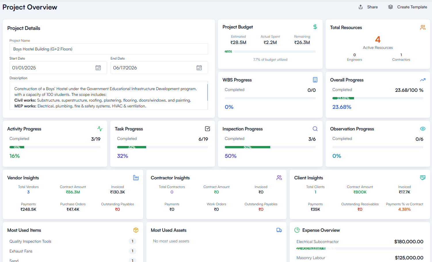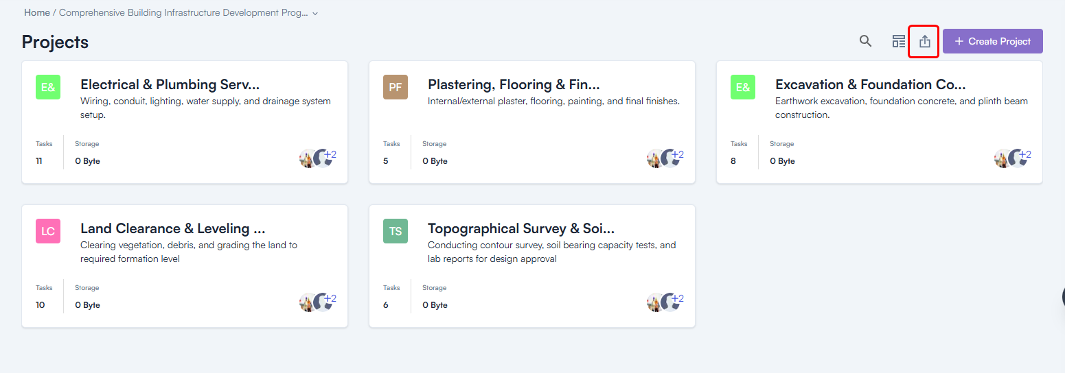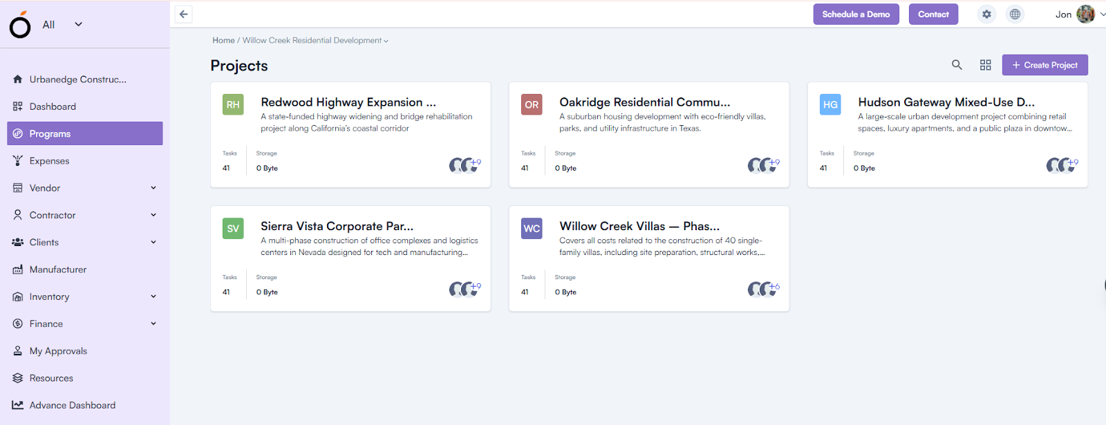 The Project Module is a central feature in construction project management that allows users to create, organize, and manage individual projects within a workspace. Each project can function independently or be associated with a broader program to ensure coordinated planning, budgeting, and progress tracking.